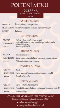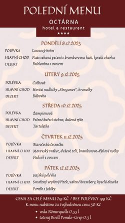 Hotel Octárna nabízí ubytování s celkovou kapacitou 49 lůžek. Všechny pokoje jsou stylově vybaveny, mají vlastní sociální zařízení s vysoušečem vlasů, pantoflemi a kvalitní hotelovou kosmetikou Manufaktura, kufrbox, TV s plochou obrazovkou, wi-fi připojení, telefon a minibar. Všechny pokoje v podkroví jsou klimatizované. Převážná část pokojů je dvoulůžkových, pro rodiny je k dispozici čtyřlůžkový pokoj v Depandanci, nebo třílůžkový apartmán, které mají ložnici zvlášť pro rodiče a zvlášť pro děti. Všechny apartmány i pokoj v Depandanci jsou vybaveny varnými sety pro přípravu kávy a čaje. Našim hostům a návštěvníkům restaurace nabízíme bezplatné parkování v uzavřeném areálu a možnost úschovy kol v uzamykatelných prostorech. Úroveň našeho ubytování snese ta nejpřísnější měřítka na čistotu, pohodlí a klid.